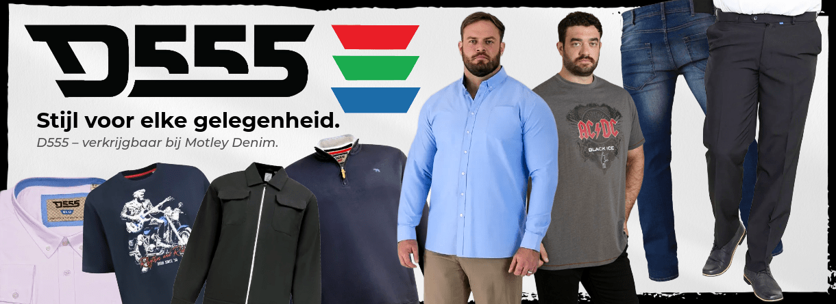 Welkom bij de online shop van Motley Denim! Bij ons vind je allerlei XL-herenkledij. Ons aanbod bestaat uit stijlvolle kleding voor mannen in grote maten. Denk maar aan jeans en broeken van W40-W70, maar ook bovenkledij, zoals T-shirts, hemden, hoodies en meer in maten 2XL-12XL. In ons assortiment vind je alle soorten herenkledij in een grotere maat - van casual tot werkkledij en sportieve outfits. Op zoek naar trendy kledij met een maatje meer? Dan ben je bij Motley Denim aan het goede adres!